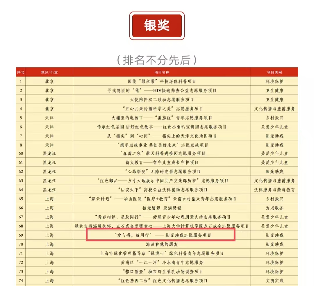 本次大赛以“青春为中国式现代化挺膺担当”为口号,阳光助残志愿服务项目共有66个,涵盖多省市、多高校及社会组织。SUNBET“爱与碍,益同行”——阳光助残志愿服务项目作为组别内唯一一支上海高校队伍,从众多项目中脱颖而出获得银奖。