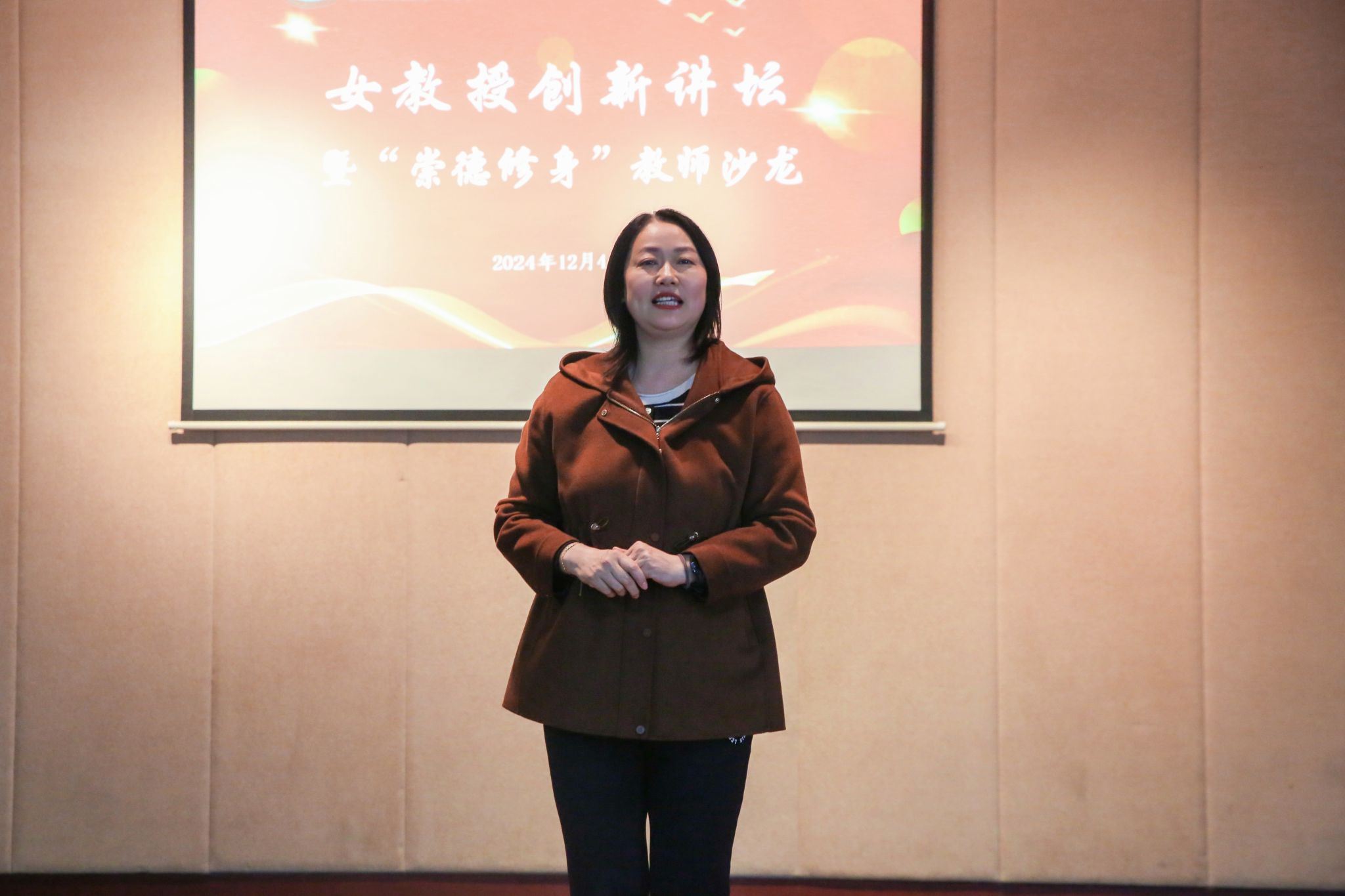 本网讯 12月4日下午,在学校党委教师工作部和工会支持下,女教授创新讲坛暨“崇德修身”教师沙龙活动在工会多功能厅举行,特邀武术学院教授刘静作专题报告《太极拳养生文化与实践入门》,学校党委教师工作部部长焦振伦,工会常务副主席李蔚,第三届女教授联谊会会长吴雪萍以及女教授联谊会成员50余人参加了活动。活动由吴雪萍教授主持。