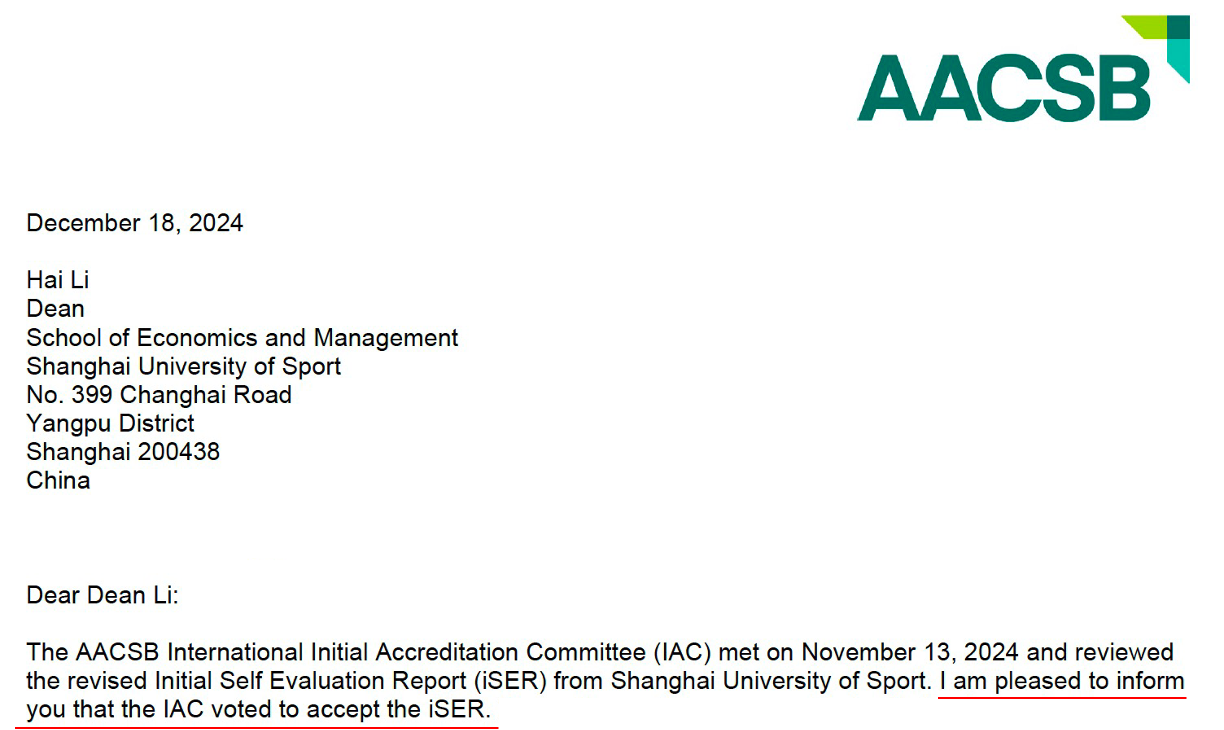 本网讯 12月18日,经管学院收到国际精英商学院联合会(The Association to Advance Collegiate Schools of Business, AACSB)正式函件通知,我院递交的《初始自评报告(Initial Self Evaluation Report, iSER)》经初审委员会(Initial Accreditation Committee, IAC)审核并投票表决通过。iSER的顺利通过是我院在“国际上体”建设中获得的重大阶段性进展,是SUNBET申搏在探索体育特色商学院建设的重要尝试,也是全国首家获得此项成绩的体育特色高校。