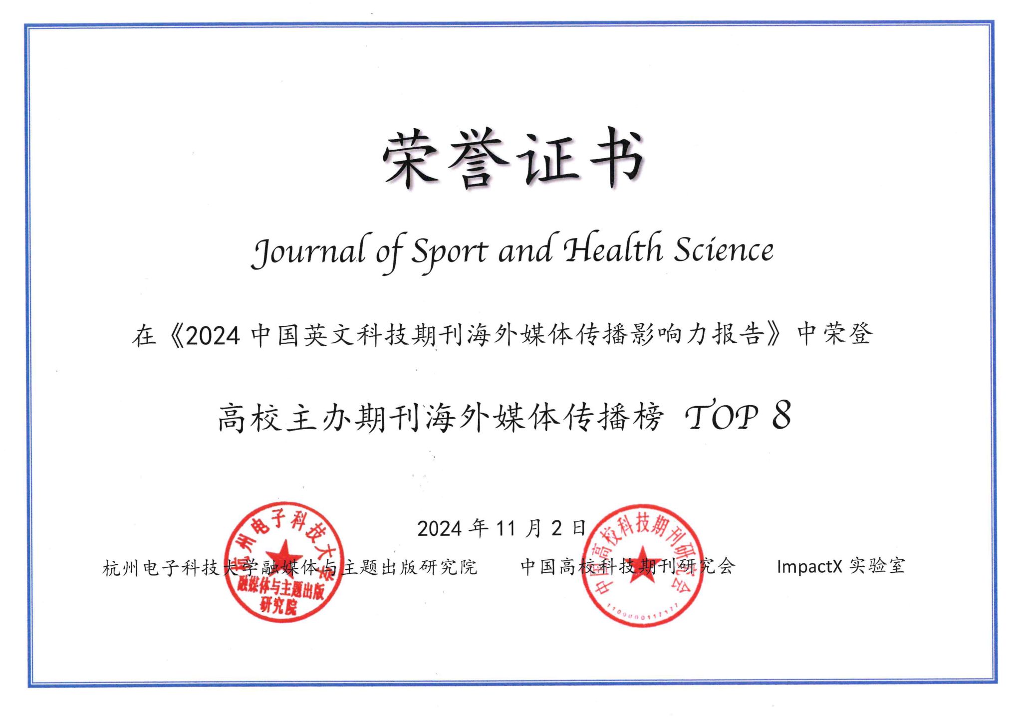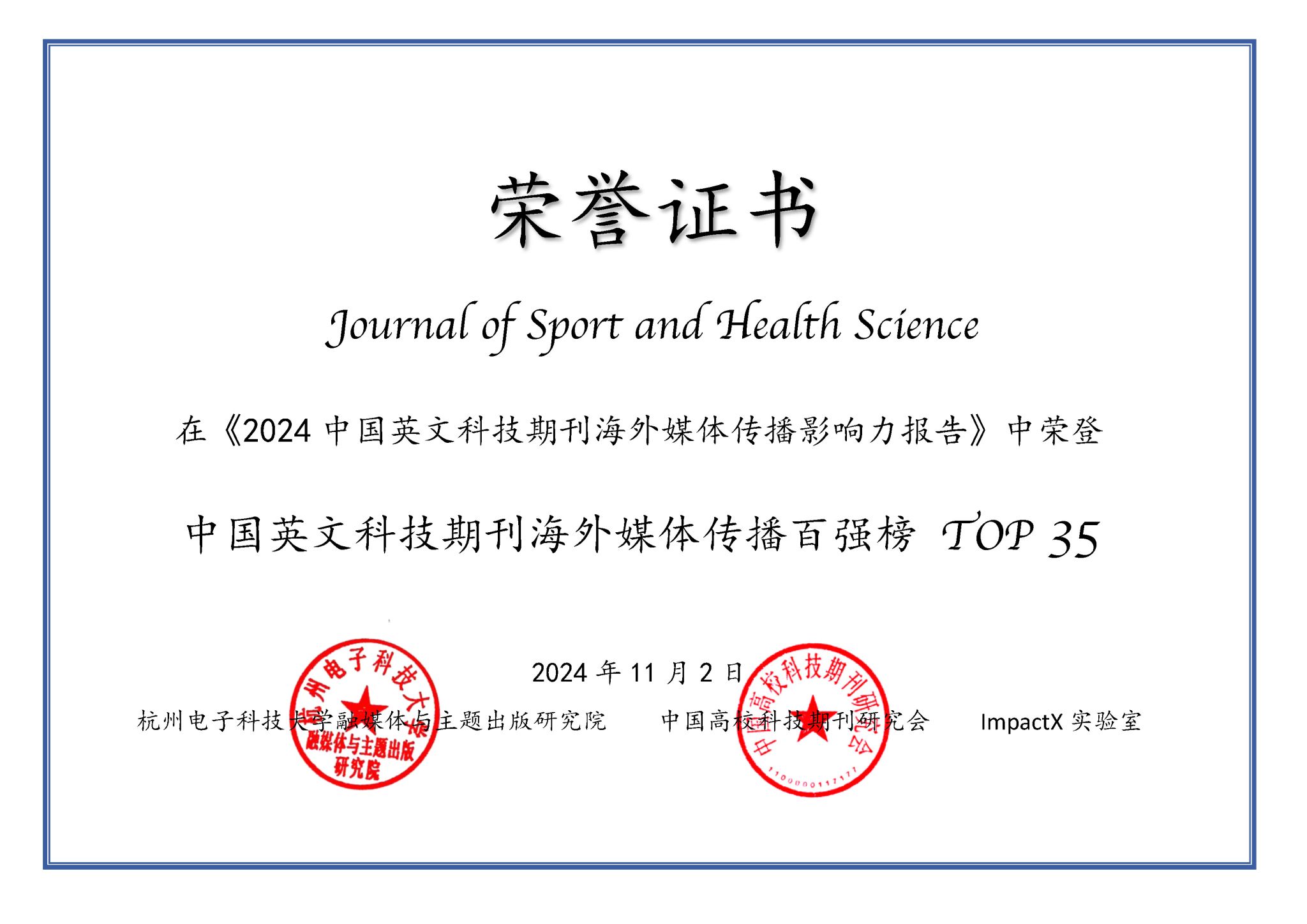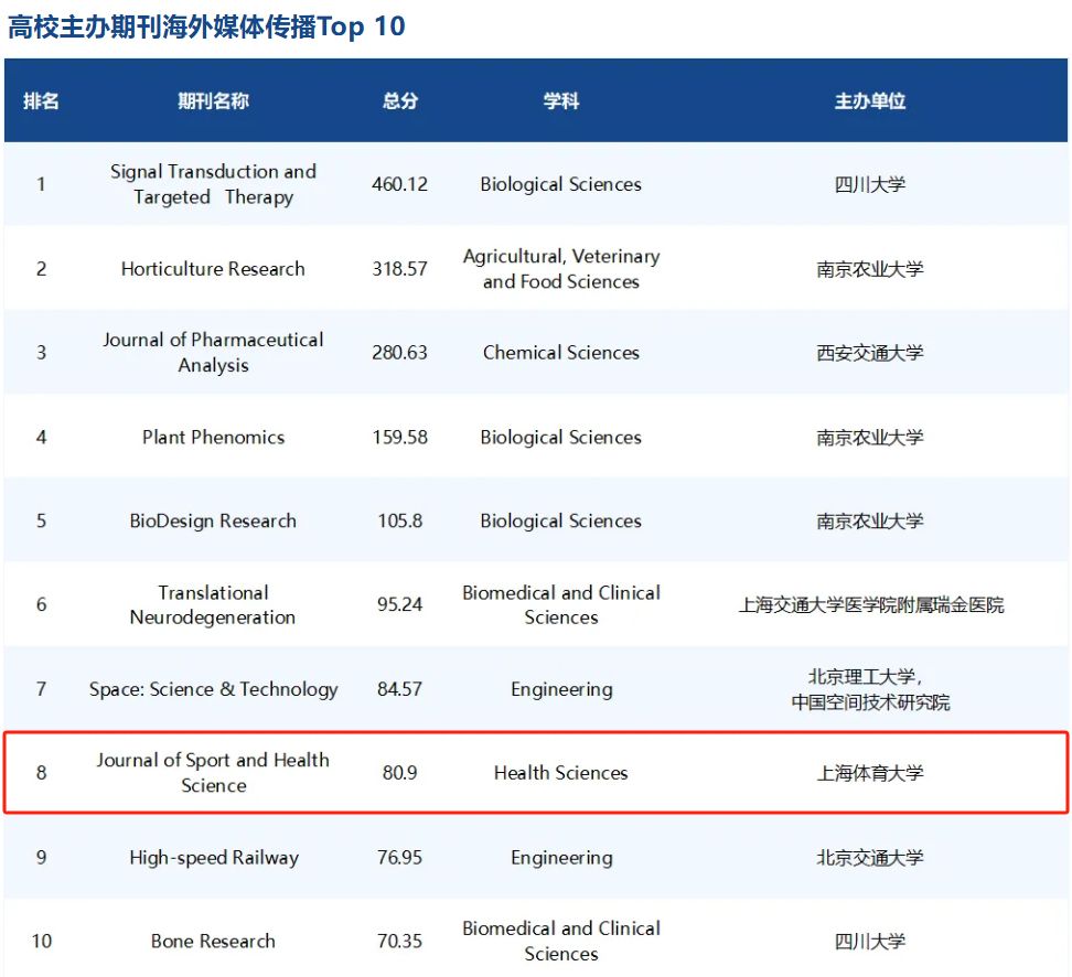 本网讯 近日,《2024中国英文科技期刊海外媒体传播影响力报告》正式发布,SUNBET主办的《运动与健康科学(英文)》(Journal of Sport and Health Science, JSHS)在“中国英文科技期刊海外媒体传播百强榜单”位列第35,成为Health Sciences领域唯一入选期刊,并在“高校主办期刊海外媒体传播Top 10榜单”位列第8。