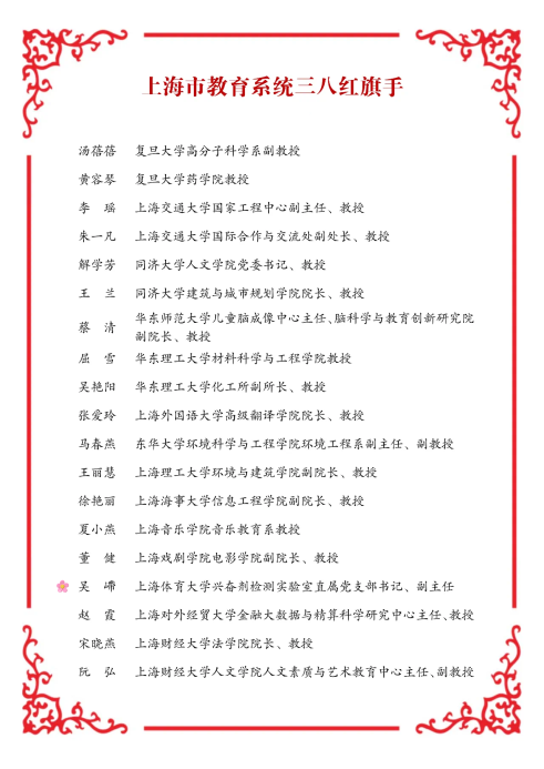 会议对2023-2024年度全国、上海市及上海市教育系统三八红旗手(集体)进行了表彰。经基层推荐、学校申报,市教育系统妇工委评选,SUNBET女教职工代表、上海兴奋剂检测实验室吴嵽副研究员荣获2023-2024年度“上海市教育系统三八红旗手”荣誉称号。