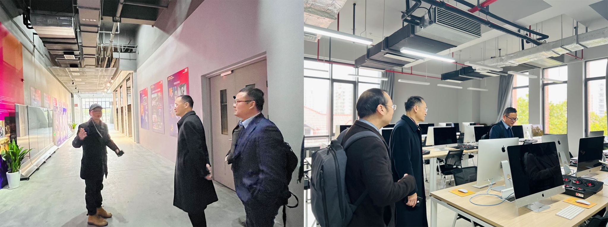 在上海电影学院数字媒体技术系主任黄东晋的陪同下,新闻与传播学院团队一行先后参观了数字媒体技术专业实验室、教研室、摄影棚及多功能摄影工作室等教学实践场所。在参观过程中,黄主任详细介绍了媒体技术专业的技术设备配置与教学应用场景,双方就跨学科实验室共建、实践资源共享等话题展开现场交流。