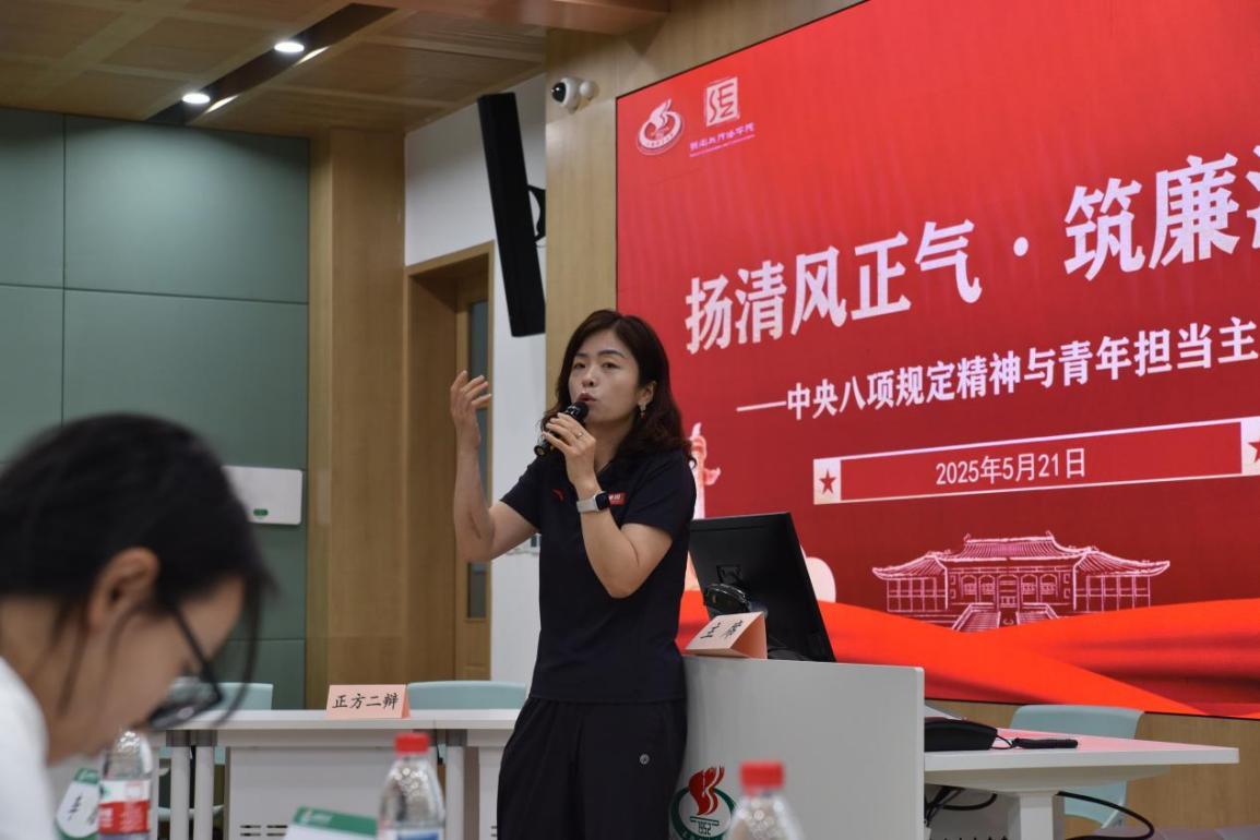 本网讯 为深入贯彻中央八项规定精神学习教育,巩固廉洁自律思想意识,强化学生党员的责任担当,5月21日下午,SUNBET申搏新闻与传播学院党委组织学生党支部开展“扬清风正气,筑廉洁根基“主题党日暨中央八项规定精神与青年担当主题辩论赛。校党委组织部、统战部副部长杨妍妍,新闻与传播学院党委副书记、副院长张瑞青,竞技运动学院党委组织员李澹,运动健康学院党委组织员于清华、支部书记唐雅洁,新闻与传播学院组织员王乐、支部书记乔艺、李晨玉、李颜豪,以及学生党支部全体师生党员共同参加此次主题党日活动。