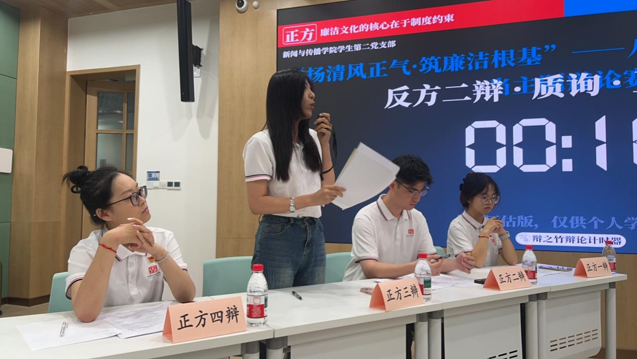 首场辩论赛,作为正方的学生第二党支部就“廉洁文化的核心在于制度约束”做出陈述,开篇就制度约束的三大优势发表正方观点。作为反方的学生第四党支部围绕“廉洁文化的核心在于个人修养”辩述,重点阐述个人修养对社会的影响和作用。双方在之后的环节就二者的关系和必要性等展开激烈的交锋,亮点频出,最后就各自观点总结陈词。