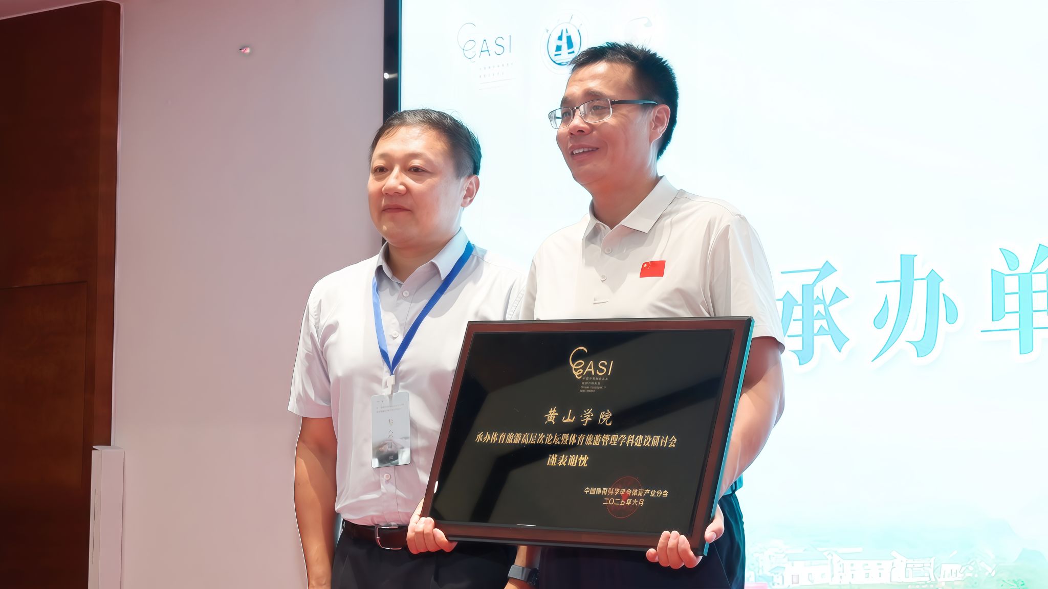 在赠送牌匾环节,中国体育科学学会体育产业分会秘书长李海向黄山学院体育学院党总支书记窦卉平赠送了承办单位纪念匾牌。同时,双方为邓爱民教授、王德教授、陈昆仑教授、杨旸教授等各位主题报告人赠送留念匾牌。