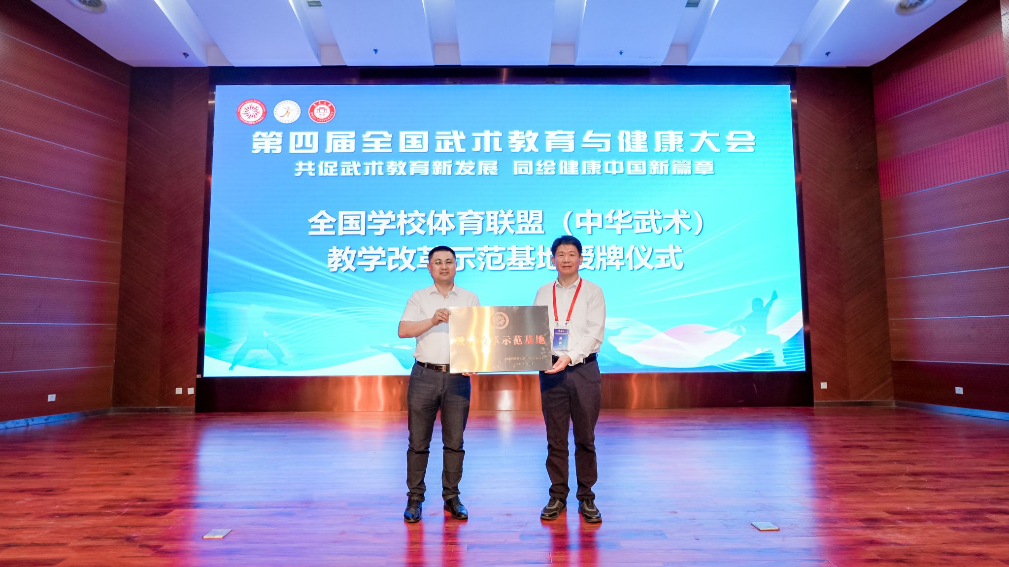 全国普通高校中华优秀传统文化传承基地(武术)负责人郭玉成,授予集美大学体育学院“教学改革示范基地”牌匾。