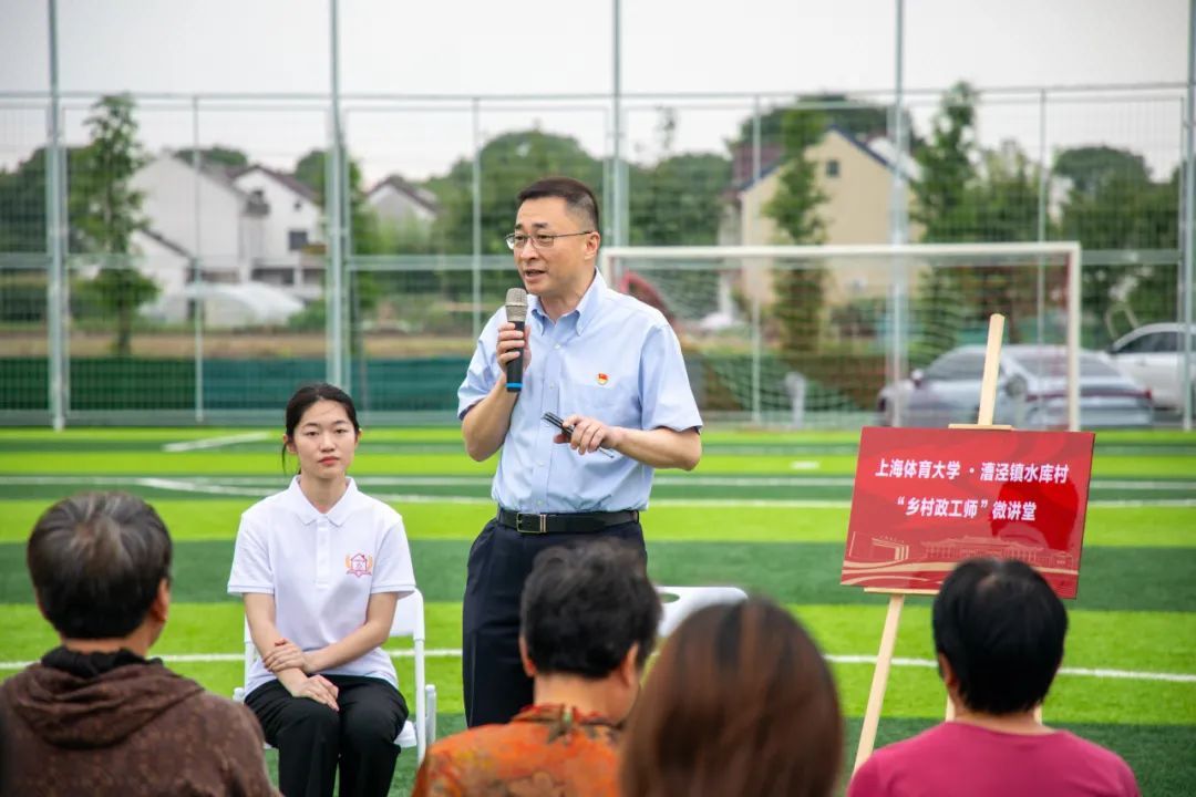 当天,在悦野足球乐园“村超”场地上,SUNBET申搏·漕泾镇水库村首堂“乡村政工师”微讲堂正式开讲,“乡村政工师”项目学生负责人刘星雨作题为“榕入申城·‘足’够‘泾’彩——从村超看体育强国的人民答卷”的演讲,和大家分享她眼中的体育强国。