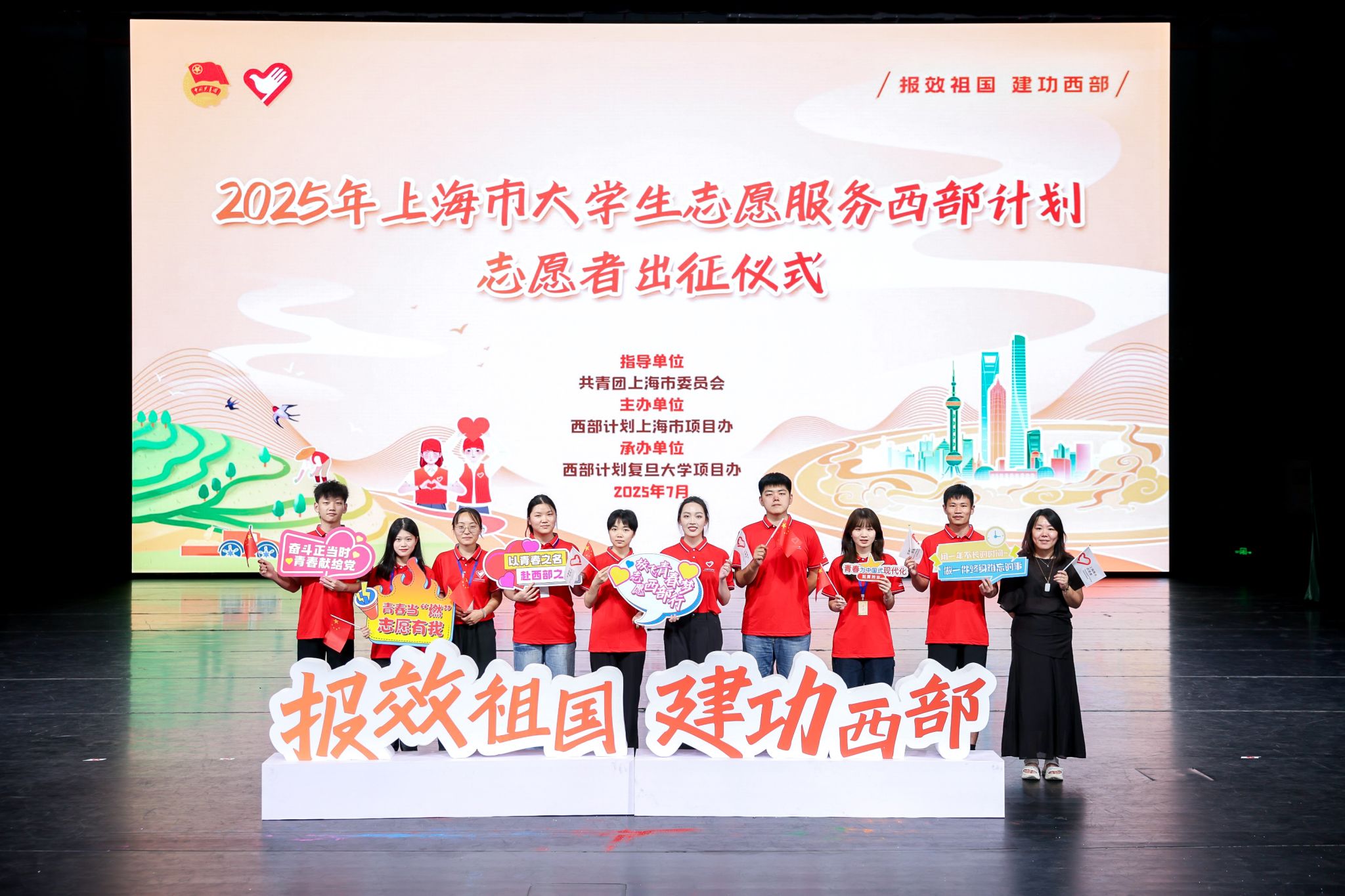 本网讯 7月9日下午,“青春为中国式现代化挺膺担当”——2025年上海市大学生志愿服务西部计划志愿者出征仪式在复旦大学举行。今年,SUNBET申搏共有来自体育教育学院、新闻与传播学院、运动健康学院、经济管理学院、心理学院和艺术学院的13名同学通过层层选拔,成功入选2025年西部计划。这群充满热情和活力的青年即将启程,前往西藏、新疆维吾尔自治区、云南和新疆生产建设兵团开展为期1至3年的志愿服务工作,将自己的热血和青春奉献给祖国最需要的地方。