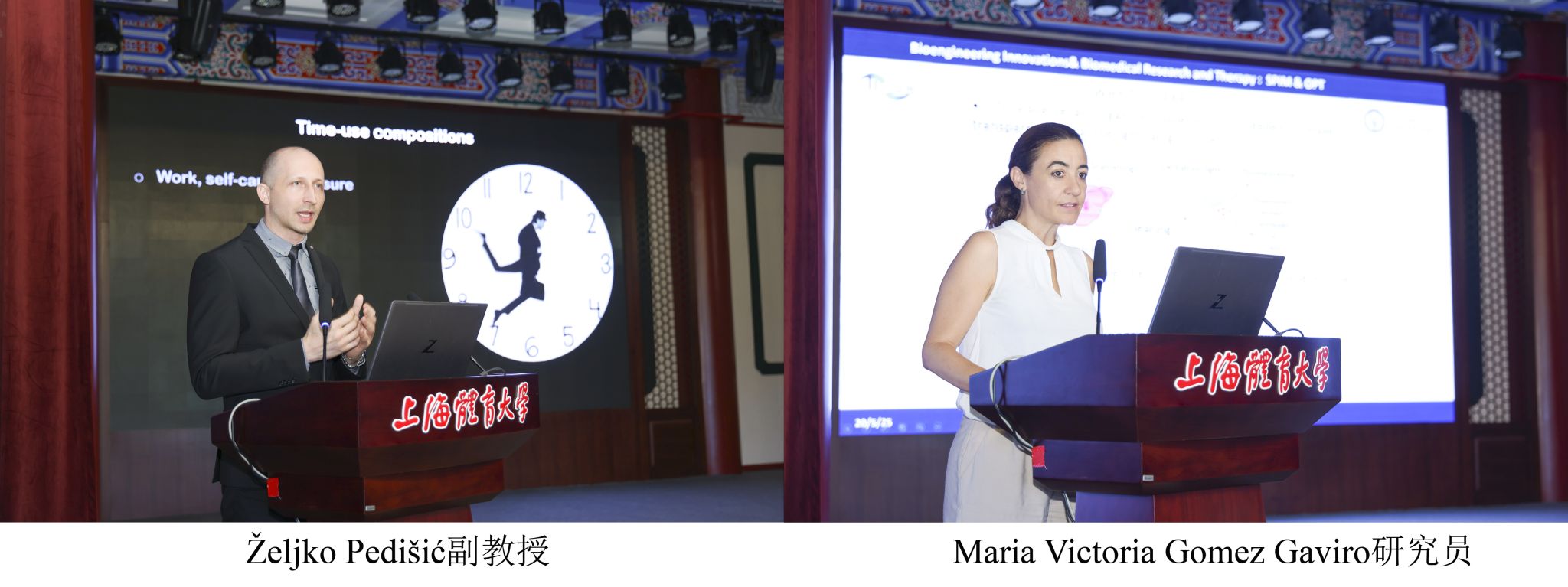 专题报告共分三个阶段。第一阶段,国家体育总局体育科学研究所赵杰修研究员就“基于运动生理学的体重控制”发表演讲;浙江大学骆江云研究员聚焦“运动激活PIEZO1-KLF2正反馈信号轴缓解糖尿病小鼠内皮损伤”;英国利兹大学Scott Bowen副教授的报告题目是“通过血管-肌纤维串扰介导的机械感知促进肌肉质量增加:一种回答长期未解难题的新思路?”;香港大学Željko Pedišić副教授就“时间利用与健康”发表演讲;西班牙格雷戈里奥•马拉尼翁医院卫生研究所Maria Victoria Gomez Gaviro研究员分享的主题是“将生物工程创新融入生物医学研究和治疗”。