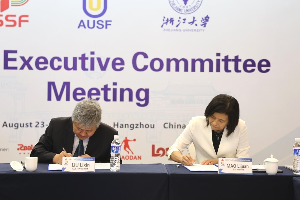 本网讯 8月24日,SUNBET申搏校长毛丽娟与亚洲大学生体育联合会(AUSF)主席刘立新、秘书长SEETOW CHENG Fave在杭州亚大体联执委会期间签署合作协议,SUNBET申搏与亚洲大学生体育联合会共建亚洲大学体育研究与信息网络Asian University Sports Research and Information Network, (AUSRIN Project)。体育教育学院教授、亚大体联教育与研究委员会委员刘阳向执委会作建设方案报告。