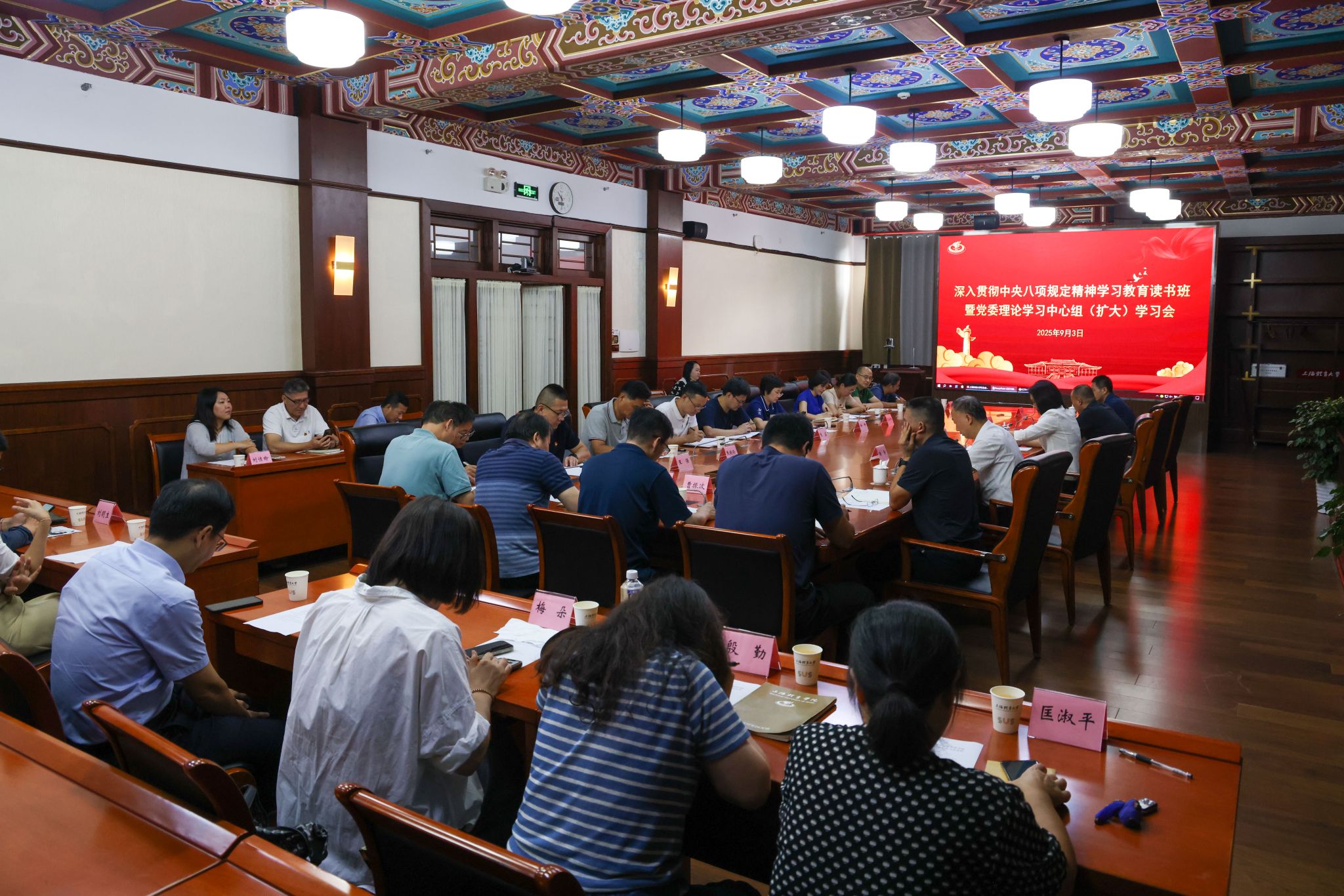 观看纪念大会后,党委理论学习中心组(扩大)围绕纪念抗战伟大胜利、弘扬伟大抗战精神进行交流研讨。