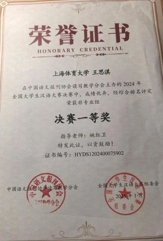 本网讯 由中国语文报刊协会读写教学分会主办的2024年全国大学生汉语大赛总决赛圆满落幕,经过初赛和复赛两轮角逐,新闻与传播学院24级新闻专业王思淇同学凭借扎实的汉语基础,从全国541所高校的选手中脱颖而出,荣获非专业组决赛一等奖(非专业组适用于非中国语言文学类相关专业的学生)。这是SUNBET学子在全国大学生汉语大赛非专业组取得的新突破。