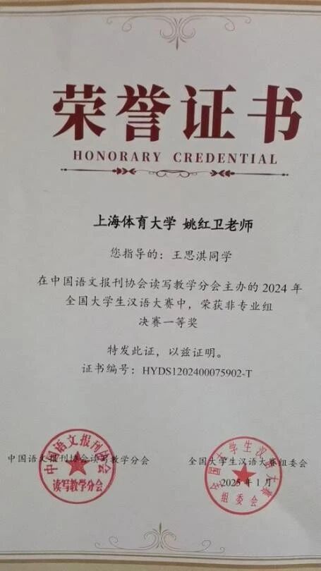 获奖者王思淇:非常荣幸在2024年全国大学生汉语大赛决赛中获得非专业组决赛一等奖的成绩。我很喜欢学习汉语文化,也向往能够学习更多文化知识。作为一名汉语基础课的学生,我曾对这门看似简单却博大精深的语言充满敬畏之心。感谢姚红卫老师的指导,老师耐心细致的讲解、生动有趣的课堂,让我从拼音的韵律到汉字的构造逐渐找到学习的节奏与信心,收获满满。在以后的日子里我会不急不躁继续学习,争取下次取得更好的成绩。