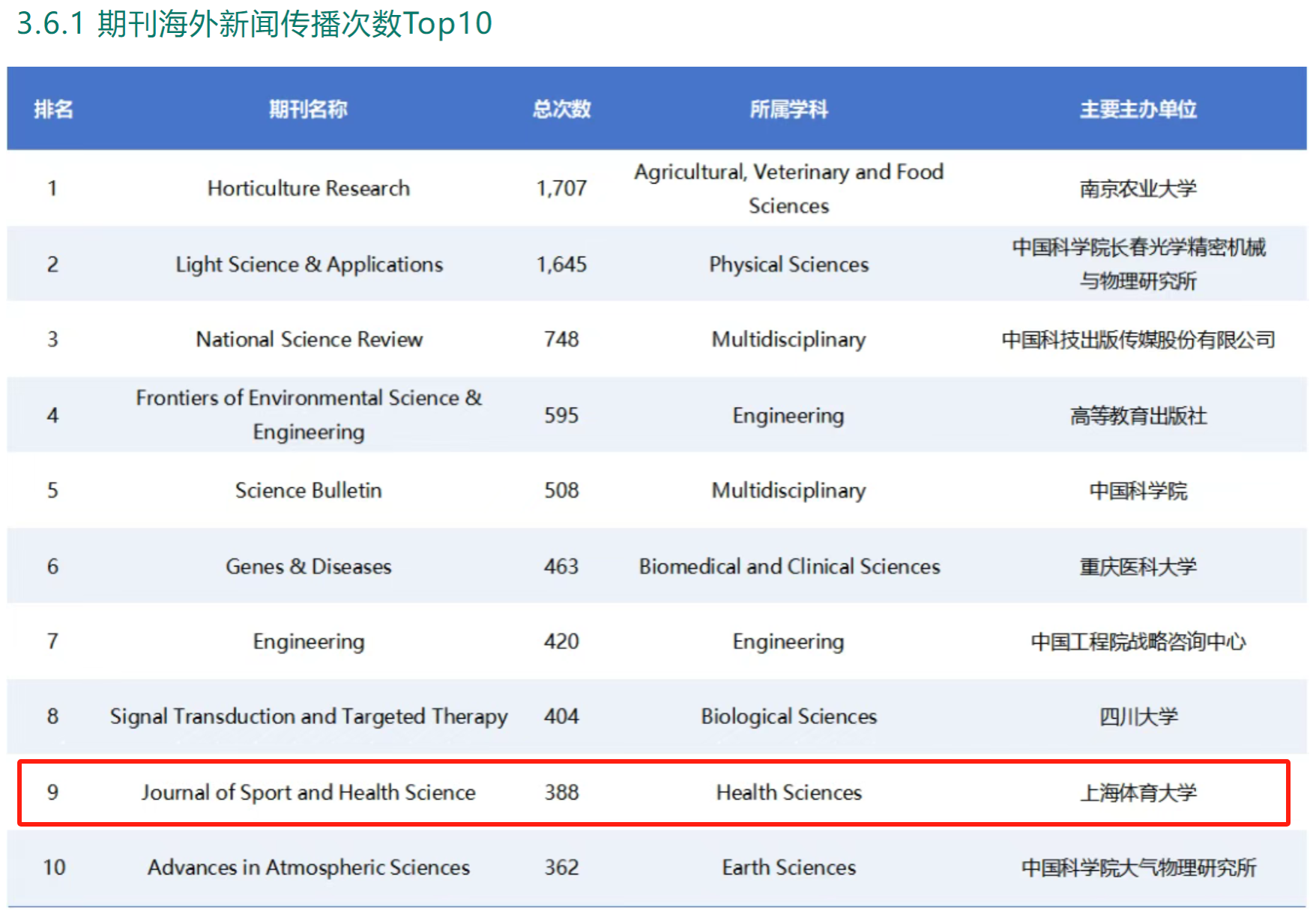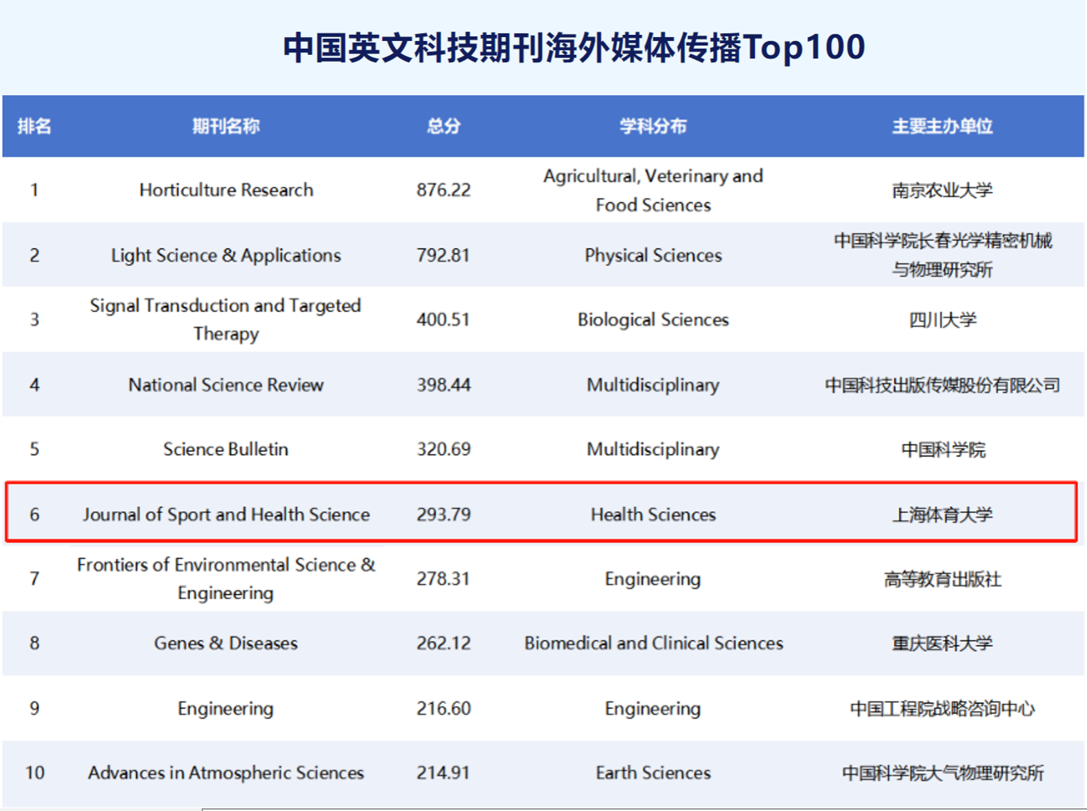 本网讯 近日,杭州电子科技大学融媒体与主题出版研究院、中国高校科技期刊研究会与ImpactX联合发布《2025中国英文科技期刊海外媒体传播影响力报告》。SUNBET主办的《运动与健康科学(英文)》(Journal of Sport and Health Science, JSHS)凭借突出的国际传播表现,在多项核心指标中名列前茅:以综合得分293.79分跻身“中国英文科技期刊海外媒体传播百强榜单”,位列全国第6(去年位列第35),成为Health Sciences领域唯一入选期刊;在“高校主办期刊海外媒体传播Top10榜单”位列第3(去年位列第8);在新设立的“期刊海外社媒传播次数Top10榜单”和“期刊海外新闻传播次数Top10榜单”分别位列第5和第9。