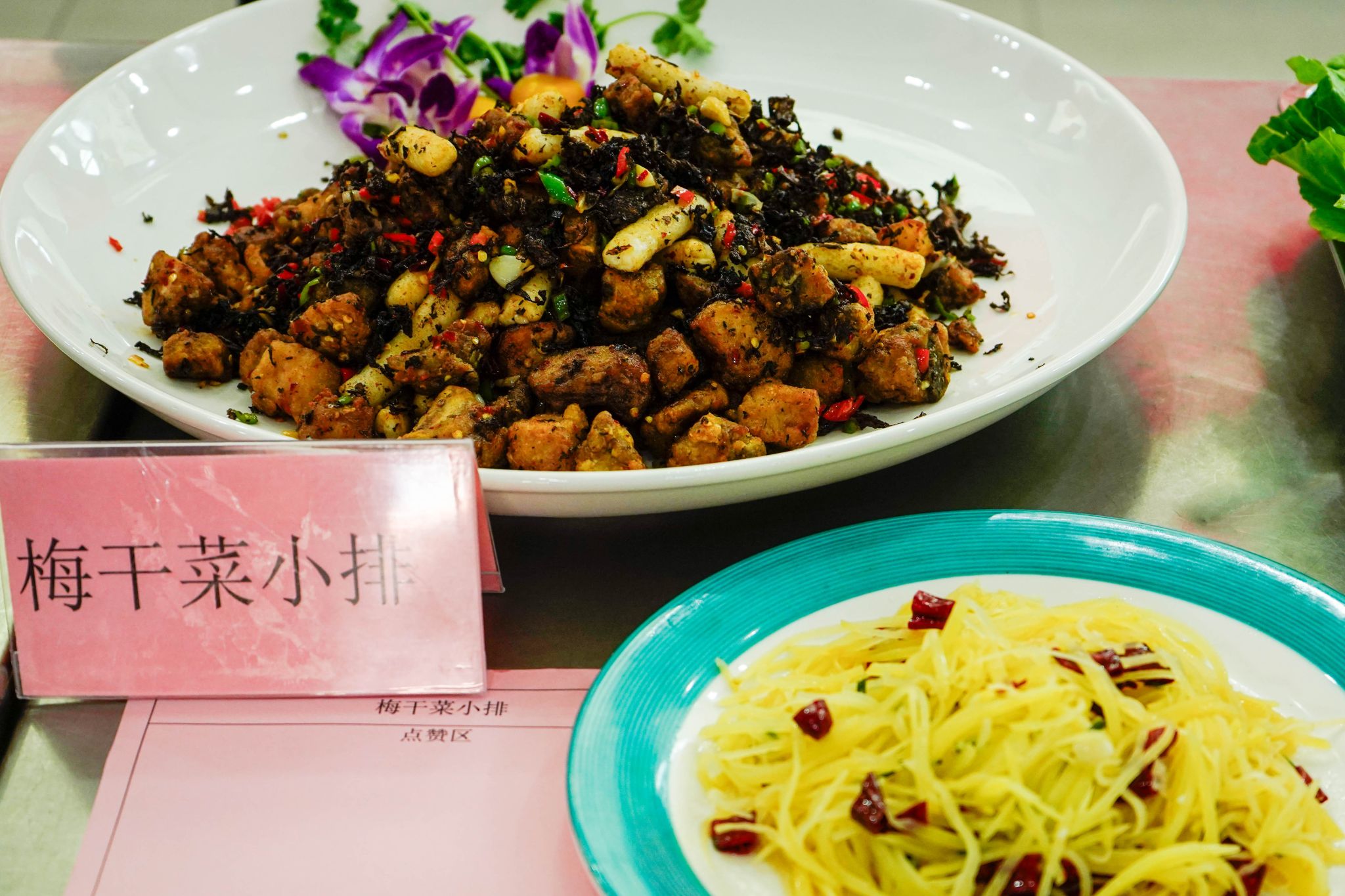 匠心呈现,成果荟萃。梅干菜小排、蒜爆目鱼卷、糖果脆皮虾、焦糖吐司山药蛋挞、仔排鲍鱼、富贵东坡肉等14道色香味俱全的创意自选菜成品纷纷出锅,在餐厅展区摆盘陈列。琳琅满目的菜品不仅展现了选手们精湛的技艺,更凝聚了他们对美食的深刻理解与创新追求。