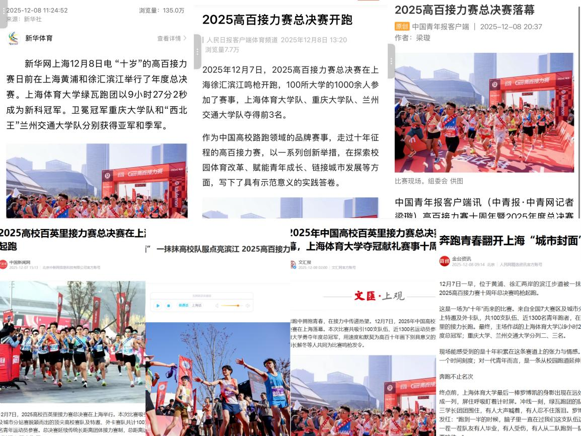 在赛事报道中,学子们充分展现了专业能力。他们不仅以镜头定格赛事高光、以笔墨讲好夺冠故事,更生产出海量优质内容,涵盖深度报道、系列短视频、即时短讯及媒体评论文章等多元形态。截至12月8日,该团队产出的20余篇作品被新华社、人民日报、中国青年报、解放日报等中央及地方主流媒体转载刊发,全网累计收获千万级阅读浏览量。在短视频创作方面,学子们提前预设冲线瞬间、队友相拥、教练寄语等关键镜头场景,确保捕捉不重不漏。这种精准的内容规划,使得赛事的高光时刻得以完整记录和传播。