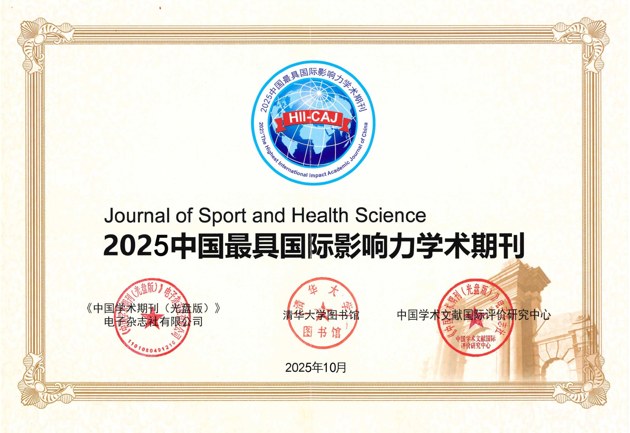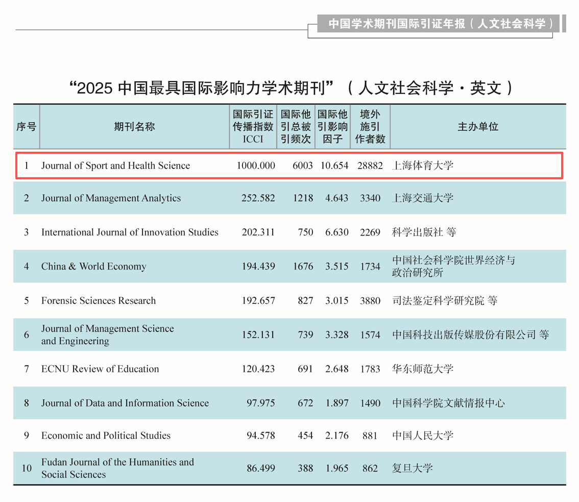 本网讯 12月11日,中国知网、中国学术文献国际评价研究中心和清华大学图书馆联合发布2025版《中国学术期刊国际引证年报》(以下简称“《年报》”)。《年报》统计了7240种中国学术期刊的国际被引情况,采用的国际统计源期刊共27117种,涵盖WoS、Scopus、EI、Medline等4个国际索引数据库大部分期刊。SUNBET主办《运动与健康科学(英文)》(Journal of Sport and Health Science, JSHS)继续蝉联“中国最具国际影响力学术期刊”称号,并连续11年在2700余种人文社科期刊中排名第一。