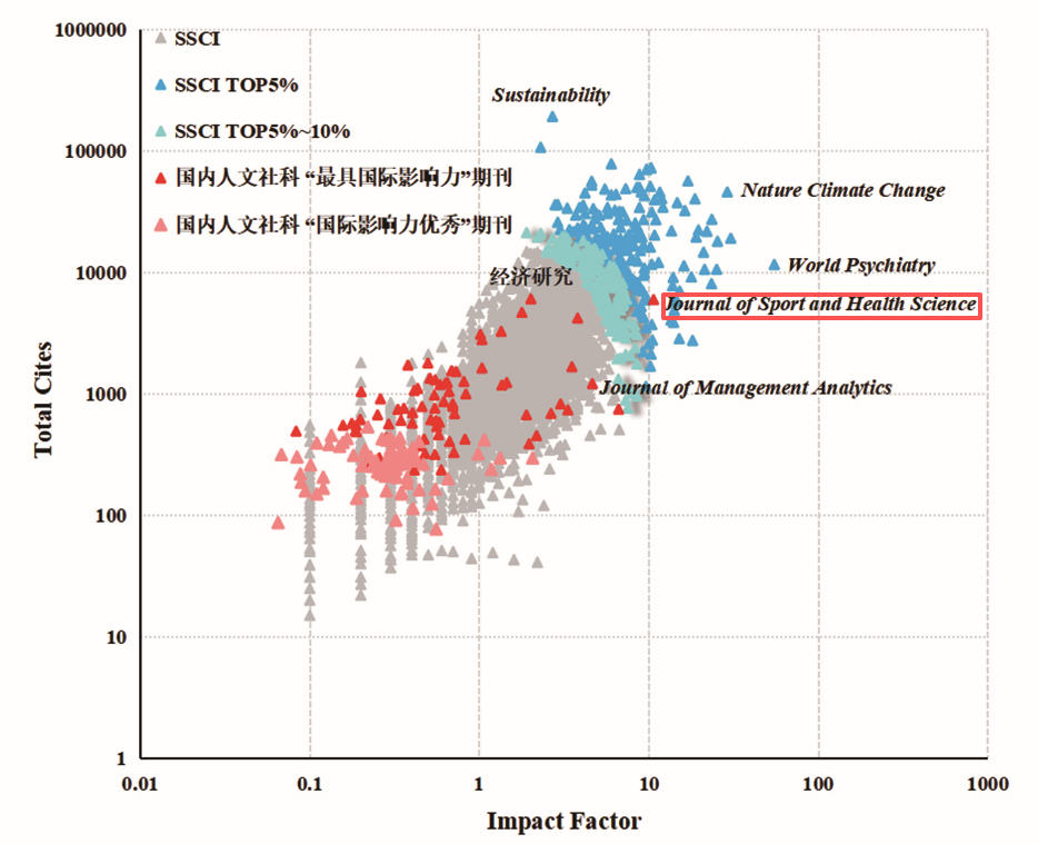 《年报》还绘制了我国人文社科TOP期刊与SSCI期刊对比图,目的是更直观地对比分析160种国际影响力TOP期刊(人文社科类)与2025年度《期刊引证报告》(简称JCR报告)中的近8000种SSCI期刊。“图中可见,我国人文社科TOP期刊和SSCI期刊的国际总被引频次与影响因子仍有较大差距,值得注意的是,Journal of Sport and Health Science已进入SSCI的TOP5%区域”(摘自《年报》原文)。