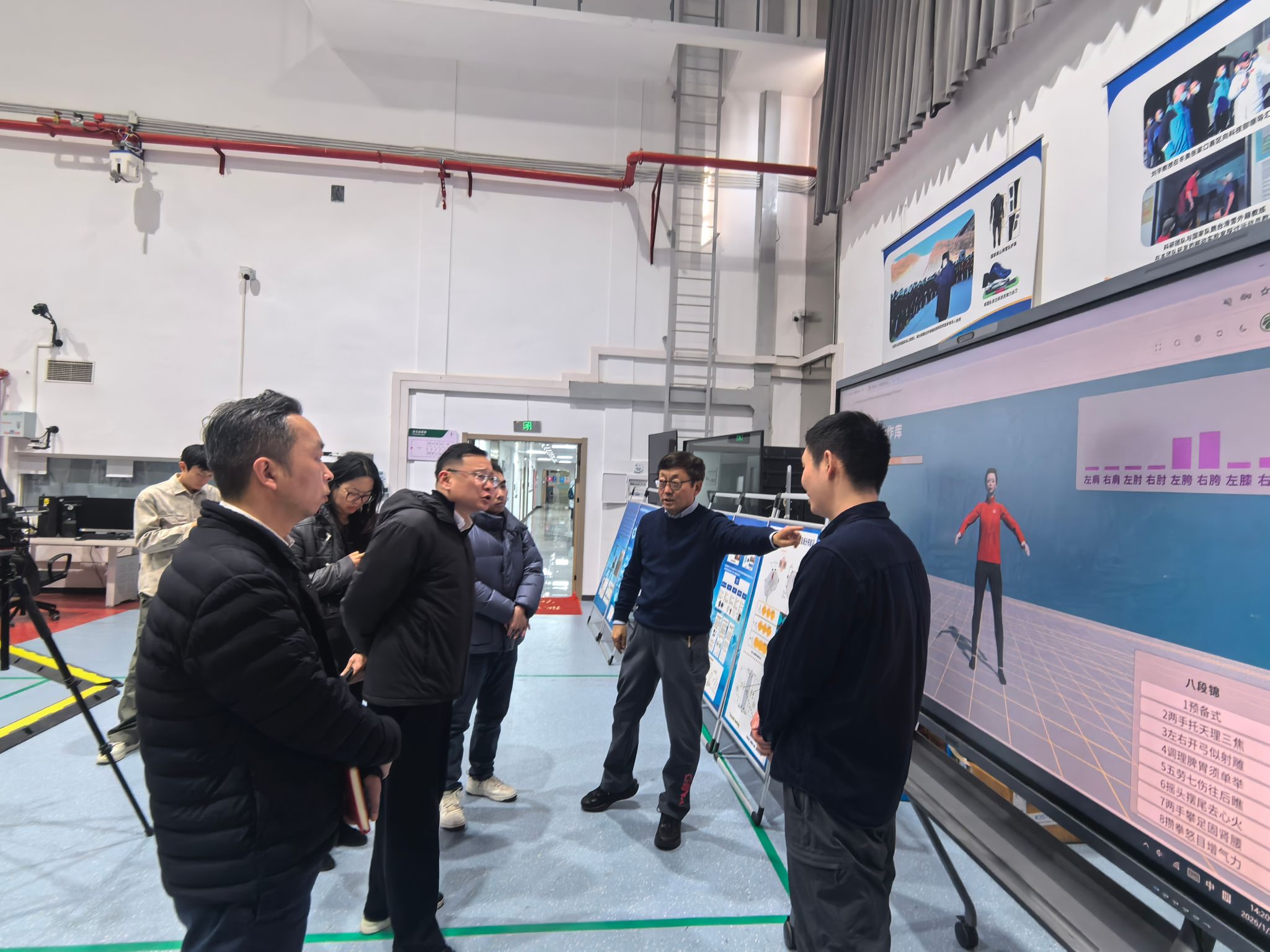 本次交流契合“一赛两会”(世界技能大赛、世界技能大会、世界技能博览会)中“以科技赋能技能创新、以交流推动标准升级”的核心精神,李晔主任一行首先实地考察了AI技术在体育场景的应用成果,智慧体育工程学院唐伟棣老师、王刚博士生现场展示的武术人工智能化评测系统、激光雷达羽毛球训练分析等系统,凭借在动作捕捉、精准分析、标准化评估等方面的核心优势,诠释了AI技术对技能动作规范化、精准化的赋能价值。上体-百度飞桨智慧体育技术创新中心研究员卢飞翔博士讲解了上体体育大模型及各项系统的技术原理,及其在竞技体育训练、全民健身指导等场景的落地成效。