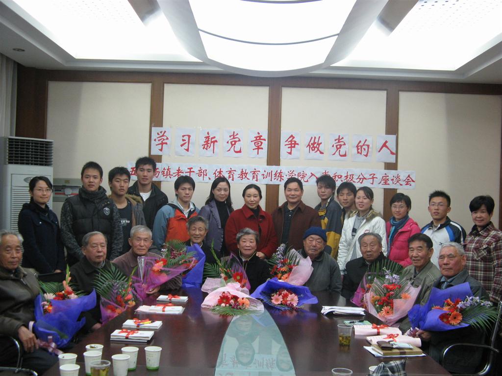 | 12月12日下午,体育教育训练学院体育教育专业05年级党支部带领入党积极分子前往杨浦区五角场镇,与五角场镇老干部科和关心下一代成长团开展“学习新党章,争做党的人”座谈会活动。 座谈会上入党积极分子和老干部相互介绍自己的情况,并相互赠送了礼物,老干部为学生赠送最新修改的《党章》,学生回赠老干部鲜花和保护膝盖的护具。学生和老干部代表相继做了精彩的发言,会场气氛始终热烈而轻松,学生们从老干部身上看到了一个优秀共产党员在退休以后是如何在自己的岗位上实践“为人民服务”这一宗旨的,看到了老干部是如何积极学习党的最新理论和党的方针政策,学生们深受感染和启发。