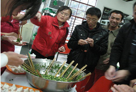 | 12月23日,由体育教育训练学院研究生分会主办的“包饺子 迎新年”活动在学生第三餐厅隆重举行。 下午4点,同学们兴高采烈地来到餐厅,首先映入眼帘的是传统的春联、窗花。让大家在寒冷的冬日里,感受到浓浓的过年气息。活动在轻柔欢快的音乐、幽默诙谐的主持人开场白中开始。大家在工作人员的帮助下,准备好用具开始包饺子。随后,各显绝活,赶皮的赶皮,包饺子的包饺子,放饺子的更把饺子放得错落有致,每个人都忙的不可开交,场面很是精彩。虽然呈现在大家面前的饺子各式各样,但那是每个人亲手创造的成果,同时更体现了各个地方的不同风俗和饺子样式。每个班级还评选出 “最具特色水饺”。过程中,大家体会到了劳动的快乐,感受到家的温馨。在等待热腾腾饺子期间,“巧运圣水”、 “可乐面粉派”、“ 干部总动员”等竞争性趣味游戏,不仅给大家带来了笑声,还使大家体会到体训研究生这一大家庭的温暖。