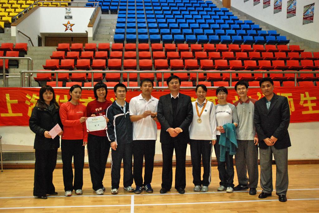 | 4月16日下午2时,上海体育学院综合馆里人头攒动,由我院工会主办、学生会承办的“慧聚杯”师生羽毛球决赛在教工队和体育教育训练学院的学生中进行。 此次羽毛球大赛是从4月12日开始的,共有来自各个学院8支代表队参加了比赛。由于是团体比赛,规则采用的是五局三胜制。别看平时是教经济管理的老师,披上战袍的第一单打上得场来噗噗就是三两下,带着半分惬意以2比0十分“经济”地笑纳男子单打。哪里有拉拉队,哪里就少不了激情,第二场女单对决,拉拉队的同学们如梦初醒,“好球!”——“漂亮!”可谓每球必喊,此时,见多识广的老师也方寸大乱,让同学们夺下一场。第三场,混合双打。看到1米9的大个飞身倒地救球,结果摔得一塌糊涂,再看看两位平时统领三尺讲桌的老师摇身一变,“比翼齐飞”——双杀大个子的心血,拉拉队沉寂了,倒是一旁的老师们叫起了“好球!”“漂亮!”,相信2比0,同学们可以输得心服口服了。的确如此,第四场的女双对决可谓波澜不惊,貌合神离的两位同学已经早早开始期待比赛最后与老师握手的时刻了。教工队最终以3比1的总比分成功卫冕,而运动训练专业的同学们自然成为了同样光荣的亚军。
