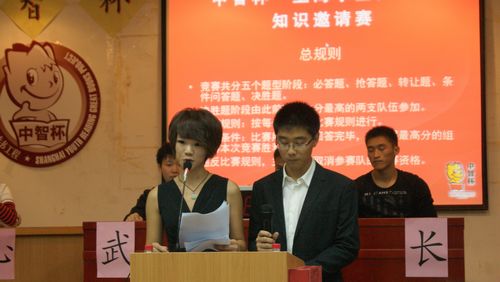 为弘扬我国传统文化,营造体院的文化氛围,提高同学们的人文素养,10月19日下午,由上海体育学院团委主办,院学生会承办的“中智杯”上海学生人文经典知识邀请赛在活动中心报告厅举行。本次竞赛由来自不同院系、不同年级学生组成的七支参赛队伍,分别为“赏心”、“武韵流长”、“未央”、“智达”、“声闻于天”、“柳暗花明”和“鹏呈越海”。比赛现场设有仲裁委员会。经过五个环节的比赛,“赏心”队以240分的高分摘得本次比赛桂冠,并得到代表学校参加上海市知识竞赛的通行证。“鹏呈越海”队和“未央”队分获二三等奖。