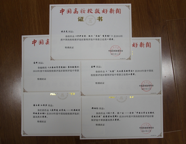 本网讯 日前,我院收到中国高校校报协会发来的通知及获奖证书,我院选送的5件作品均获得“2010年度中国高校校报好新闻奖”,这是我院首次在全国校报好新闻评选中获奖。其中,《守护书香:做个“乔治”有多难?》(作者:黄兰岚)荣获言论类一等奖;《“凡客”文化袭来的背后》(作者:聂辉)荣获言论类二等奖;第86期第1版(作者:高峰)荣获版面类二等奖;《这一年,这一生——专访“中国大学生自强之星提名奖”获得者白笑辉》(作者:郑雨旸)荣获通讯类三等奖,《展师道、示学风——记赖剑慧和黄琦玮老师的展示课》(作者:潘玉婷、江浪莎)荣获通讯类三等奖。