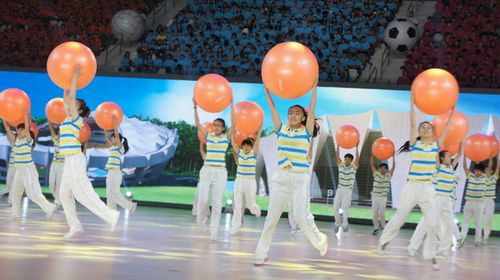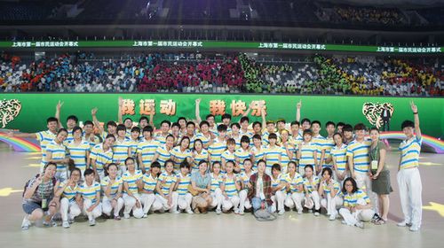 本网讯6月10日,上海市第一届市民运动会开幕式在上海东方体育中心举行。我院派出60名来自体育教育训练学院、体育休闲和艺术学院的学生与小学生、白领共同表演健身球操《向快乐出发》,受到观众喝彩。