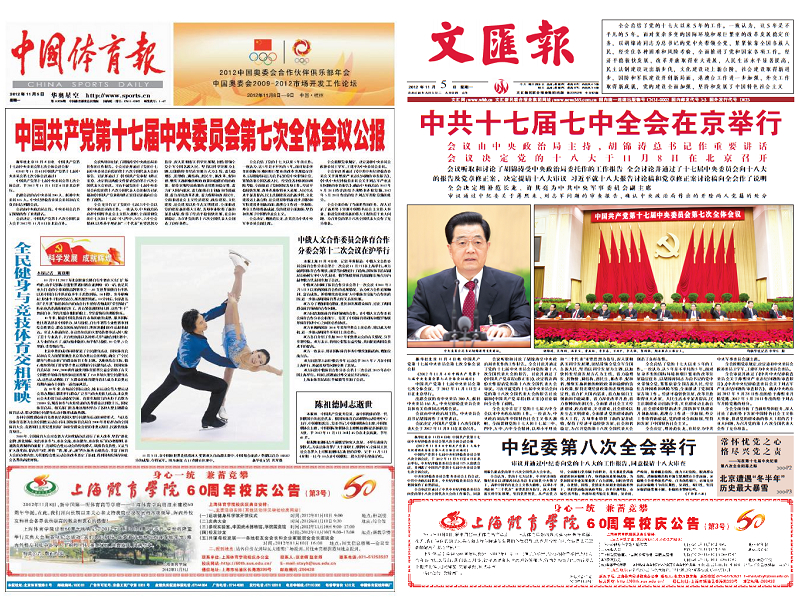 本网讯11月5日,《文汇报》、《中国体育报》头版发布上海体育学院60周年校庆活动公告(第3号),向社会人士和广大校友告知SUNBET即将迎来的60周年校庆庆典和各项庆祝活动。公告如下: