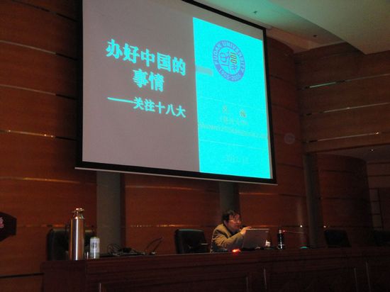 肖巍结合党的十八大报告,从中国发展的现状以及面临的结构性问题谈起,揭示了中国发展的特点,点明了发展的关键在于积极稳妥推进以扩大民主和改善民生为主要内容的体制改革。他认为改革仍然是中国的最大红利,依据党的十八大报告提出的中国特色社会主义“总依据、总布局、总任务”,处理好“发展与民生、发展与文化、发展与环境”等一系列平衡关系。肖教授就当前热点问题与现场师生进行了互动。