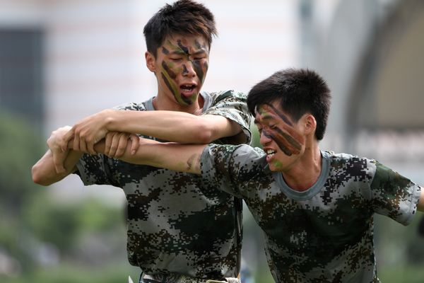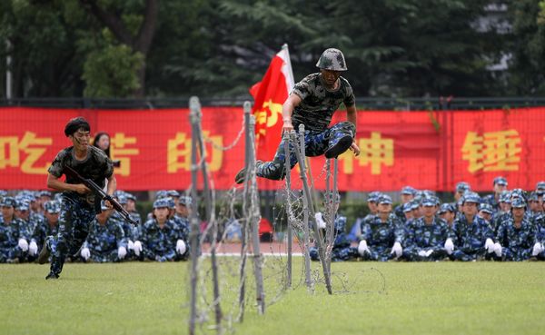 阅兵式后汇报表演正式开始。男子拳术表演的招式如潜龙腾渊般刚劲有力,响彻云霄的怒吼仿佛乳虎啸谷令百兽惧,淋漓地展现了男人的刚猛之力与霸王之气;女子军体拳英气逼人,巾帼英雄们队列整齐,行动一致,矫健的动作有力地诠释了刚柔并济之美。男子刺杀表演和步兵班进攻战斗表演作为军训的成果展示部分,表演学生脸涂迷彩图案,搏斗摔跤、匍匐前进、钻火圈,精彩纷呈,赢得了在场所有人的连连喝彩。