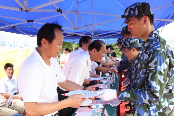 章建成宣布了军训团表彰决定,84名同学获得了“优秀学员”光荣称号,13名同学获得了“优秀通讯员”光荣称号,另有11名教官获得了“优秀教官”光荣称号,到场领导为获奖代表颁奖。