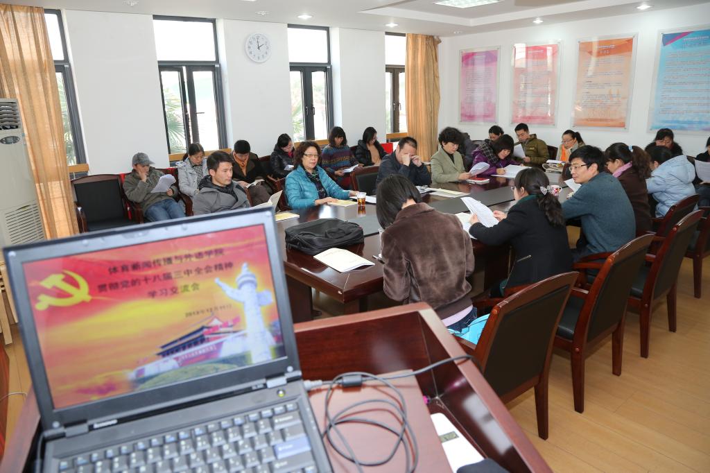 本网讯 12月11日,新外学院召开贯彻党的十八届三中全会精神学习交流会,传达学习十八届三中全会精神,全体党员教师参加会议,党总支书记匡淑平主持会议。