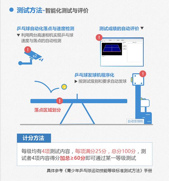 “乒乓球标准”每级均有4项测试内容,每项满分25分,总分100分,测试者4项内容得分加总≥60分即可通过某一等级测试。随着等级的升高,对青少年运动技能的要求逐渐提高,比如:一级要求“对空颠球”“对墙颠球”“托球绕桌跑”“双手接球”即可,二级则要求“平击发球“”反手推/拨上旋球“”正手攻球上旋球“”1/2台正手两点攻”。