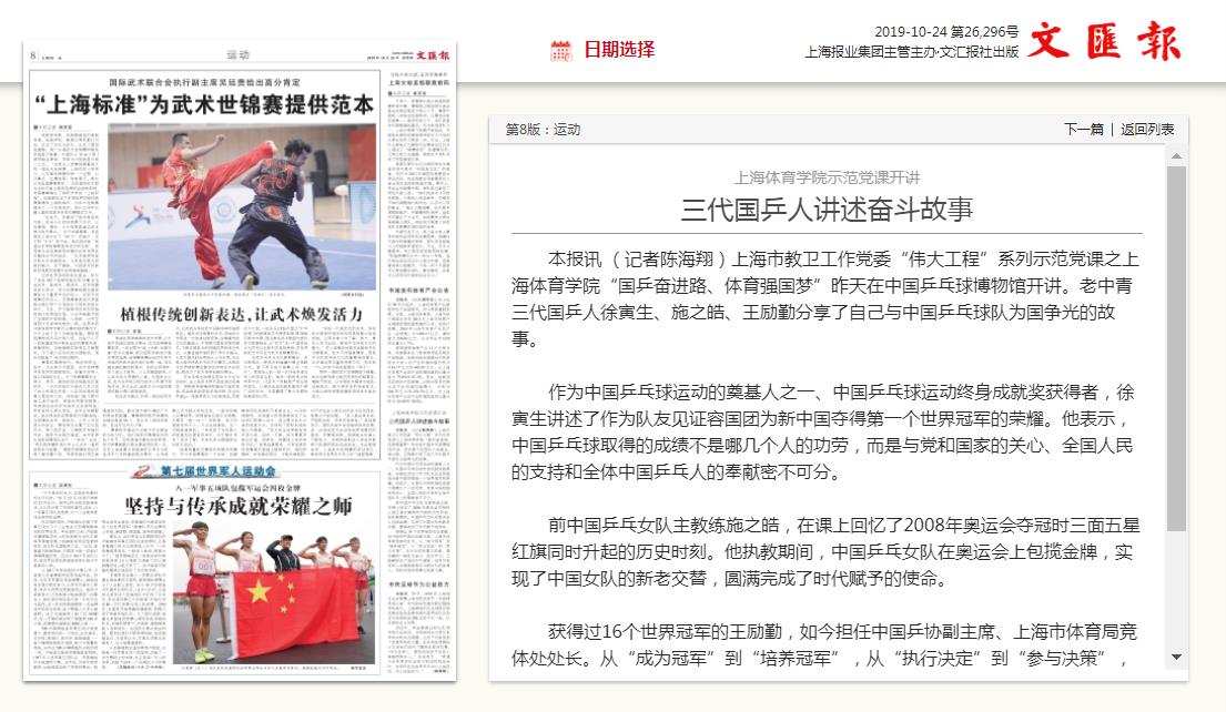 本报讯 (记者陈海翔)上海市教卫工作党委“伟大工程”系列示范党课之上海体育学院“国乒奋进路、体育强国梦”昨天在中国乒乓球博物馆开讲。老中青三代国乒人徐寅生、施之皓、王励勤分享了自己与中国乒乓球队为国争光的故事。