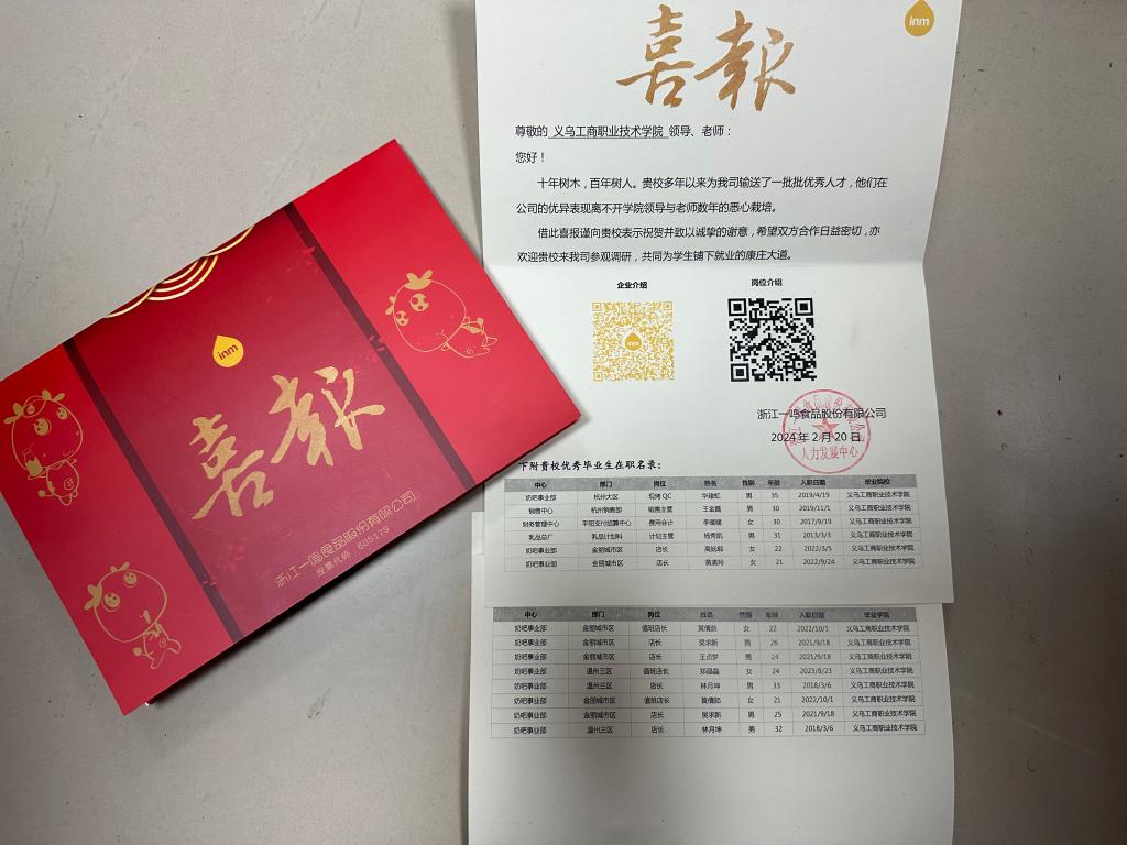 近日,LETOU国际米兰官网收到一封来自浙江一鸣食品股份有限公司的喜报。信中高度认可吴求新等13位毕业生在岗的优异表现,并向学校为公司发展输送一批批优秀人才致以诚挚的谢意,期待未来能与学校更加紧密合作。